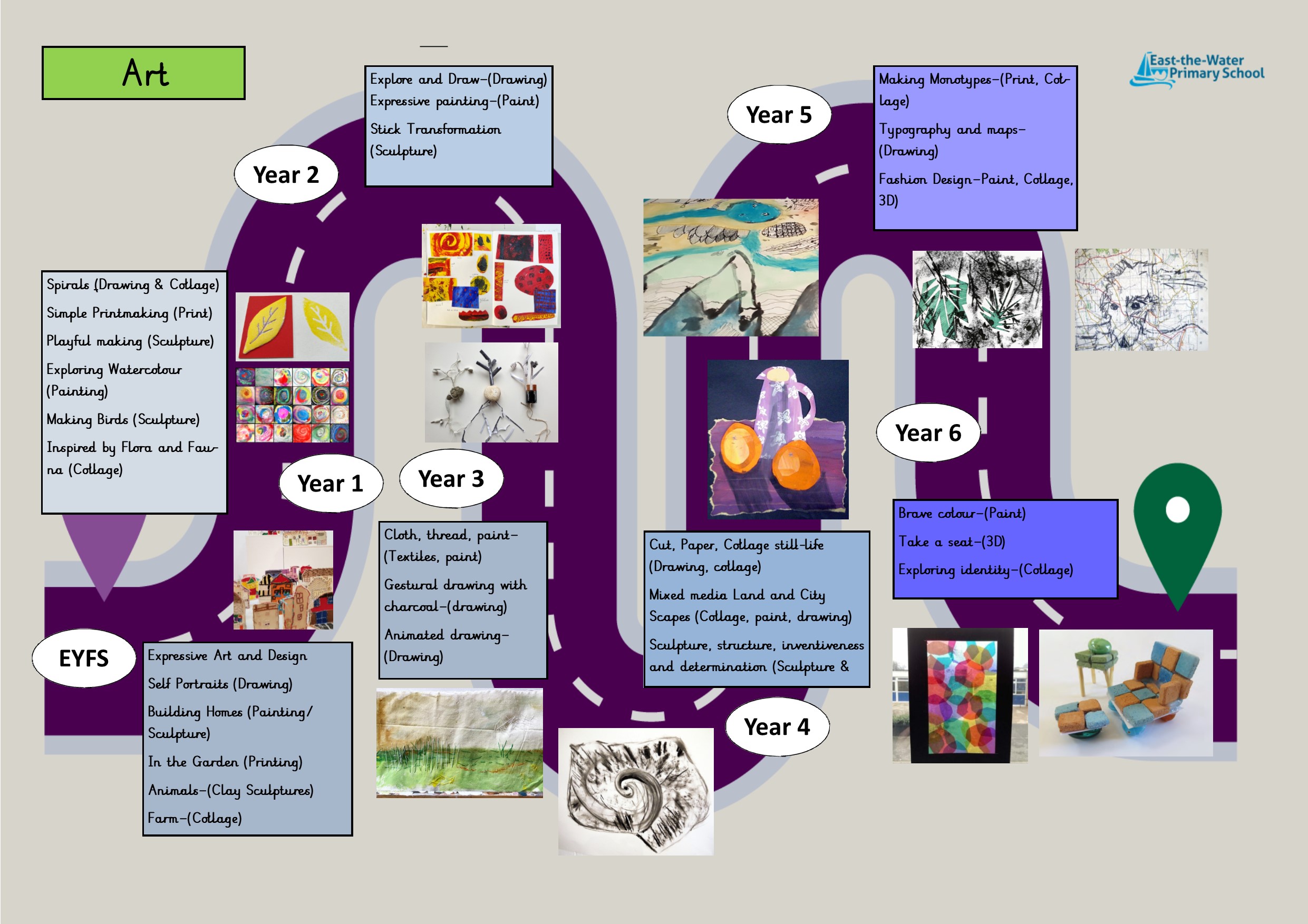 At East-the-Water Primary School, we strongly believe that Art and Design provides an essential role in the education of a well-rounded child. Through the study of art we want to engage, inspire and challenge pupils by introducing them to a wide range of techniques, materials and artists. We strive to equip them with the knowledge and skills to experiment, explore, take risks, invent and create. We believe that through the study of art pupils can explore their own identity as well as being curious. Through carefully sequenced teaching, pupils build knowledge of materials, processes and artistic vocabulary over time, so that they can think critically, selecting creative elements to produce individual high-quality outcomes. Studying art at East-the-Water Primary School provides an opportunity for pupils to learn respect, to gain an understanding of other cultures and the historical importance of art. Most importantly, we want them to foster a positive, life-long relationship with the subject and embody the truth that every child is an artist.